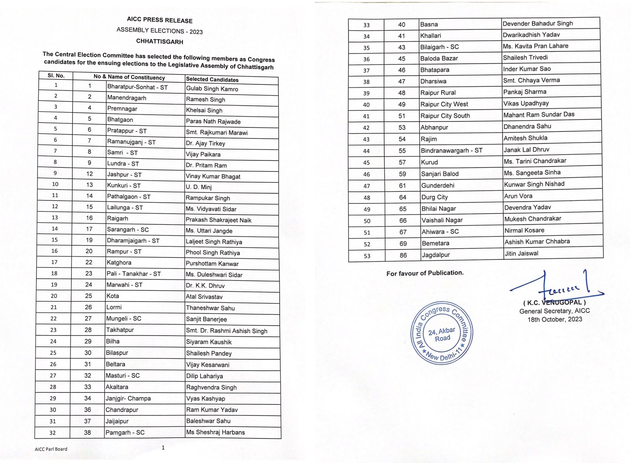 कांग्रेस ने दूसरी सूची जारी की है। इस तरह पार्टी अब तक 90 में से 83 उम्मीदवारों के नाम का ऐलान कर चुकी है और अब सिर्फ सात सीटों के लिए नाम घोषित होना बाकी रह गया है। कांग्रेस ने दूसरी सूची में 10 विधायकों को दोबारा मैदान में नहीं उतारा है। यह स्थान हैं मनेंद्रगढ़, प्रतापपुर, रामानुजगंज, सामरी, लैलूंगा, पाली तानाखार, बिलाईगढ़ धरसीवा, रायपुर ग्रामीण, अहिवारा और जगदलपुर।
