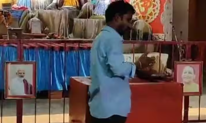 नवरात्रि वाराणसी : वाराणसी में इस बार नवरात्री एक अलग अंदाज में मनाई जा रही है. दुर्गा पंडाल में पीएम मोदी और सीएम योगी की तस्वीरें लगाई गई हैं.नगर निगम ने कहा ये समिति का निजी विचार है.