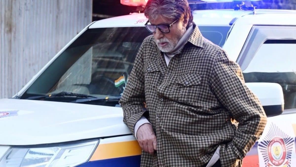 Amitabh Bachchan posing next to Mumbai police van