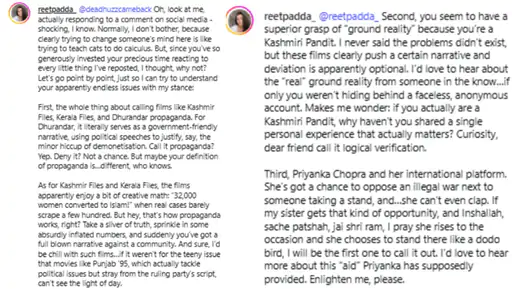 एक्ट्रेस अनीत पड्डा की बहन रीत ने धुरंधर 2 को प्रोपेगैंडा फिल्म बताया और एक्ट्रेस प्रियंका चोपड़ा की ऑस्कर सेरेमनी के दौरान युद्ध मुद्दे पर चुप्पी की आलोचना की। दरअसल, इंस्टाग्राम पर एक यूजर ने रीत के पहले के पोस्ट और राजनीतिक मुद्दों पर उनके रुख पर सवाल किया गया था। जिसके बाद रीत ने जवाब देते हुए लिखा कि वह आमतौर पर सोशल मीडिया पर बहस में शामिल नहीं होतीं, लेकिन इस बार उन्होंने हर मुद्दे पर अपनी बात रखने का फैसला किया।