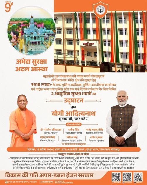 महायोगी गुरु गोरखनाथ की पावन नगरी गोरखपुर में श्री गोरखनाथ मंदिर क्षेत्र की सुरक्षा हेतु ₹918 लाख से अपर पुलिस अधीक्षक, पुलिस उपाधीक्षक कार्यालय एवं कंट्रोल रूम तथा पुलिस स्टोर रूम एवं मेंटेनेंस वर्कशॉप के लिए निर्मित 2 आधुनिक सुरक्षा भवनों का उद्घाटन समारोह
