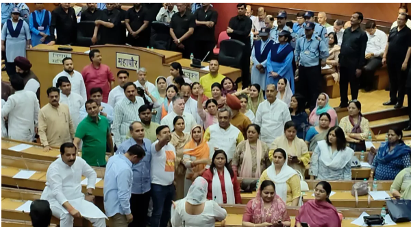 दिल्ली नगर निगम की सदन की बैठक में शुक्रवार को भाजपा और आप के पार्षद आमने-सामने आ गए। आप के पार्षदों ने निगम मुख्यालय में डॉ. अंबेडकर की मूर्ति के पास भाजपा के खिलाफ नारेबाजी की। फिर सदन में पहुंच भाजपा के खिलाफ नारेबाजी की। करीब एक घंटे तक चली नारेबाजी के बाद मेयर ने सदन की कार्यवाही स्थगित की।