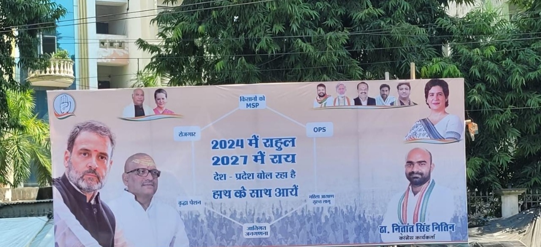 कांग्रेस कार्यालय के बाहर लगे इस पोस्टर में लिखा है — 2024 में राहुल और 2027 में राय’।