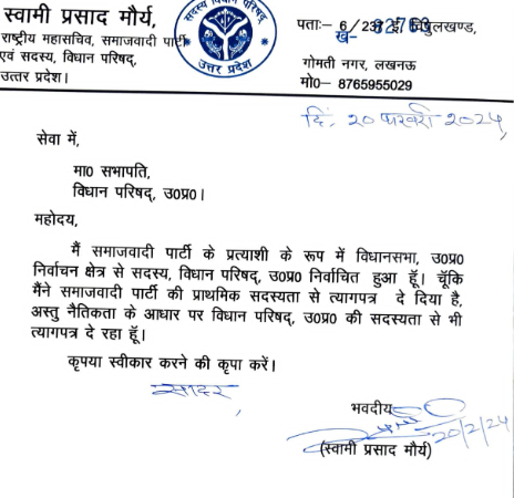 लखनऊ: समाजवादी पार्टी की प्राथमिक सदस्यता और विधान परिषद की सदस्यता से स्वामी प्रसाद मौर्य ने इस्तीफा दिया। स्वामी प्रसाद मौर्य 22 फरवरी को राष्ट्रीय शोषित समाज पार्टी बनाएंगे। वह कांग्रेस के साथ गठबंधन कर सकते हैं।
