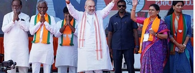 यूनियन होम मिनिस्टर अमित शाह ने भाजपा राष्ट्रीय उपाध्यक्ष डीके अरुणा, पार्टी के ओबीसी मोर्चा के अध्यक्ष के एल लक्ष्मण और अन्यों के साथ ‘सकल जनुला विजय संकल्प सभा’ में जनसमूह को हाथ हिला कर सलाम किया, जो तेलंगाना विधानसभा चुनाव के आगे, जोगुलाम्बा गडवाल जिले में, शनिवार, 18 नवंबर, 2023 को हुआ।