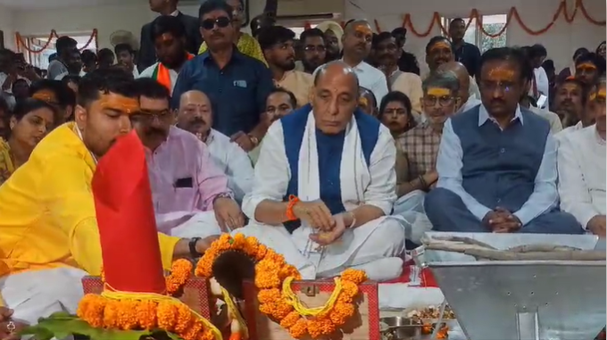 उत्तर प्रदेश : हजरतगंज स्थित हलवासिया कोर्ट में लोकसभा चुनाव संचालन कार्यालय का  ब्राह्मणों द्वारा यज्ञ-पूजन कार्य को भारत सरकार रक्षामंत्री  राजनाथ सिंह ने कराया।