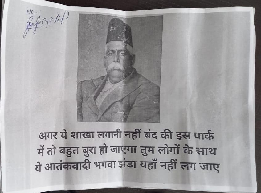 आरएसएस वर्कर वाईपी सिंह ने बताया, 22 अक्टूबर की सुबह शाम 5 बजे जब कुछ स्वयंसेवक पार्क में सफाई करने गए तो वहां डॉ. केशव बलिराम हेडगेवार के फोटो के साथ कुछ पत्र पड़े हुए मिले। इन पत्रों में लिखा था — अगर ये शाखा लगनी बंद नहीं की तो इस पार्क में बहुत बुरा हो जाएगा। तुम लोगों के साथ में भगवा झंडा यहां लग न जाए।