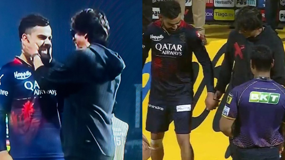 After his team registered a massive 81-run win, SRK went down in the middle as he met and hugged every player on the field from both sides. He also met Kohli and gave him a tight hug and the RCB star asked him to teach him the “Jhoome Jo Pathaan” dance step. SRK didn’t waste any team as he taught Kohli the famous move.